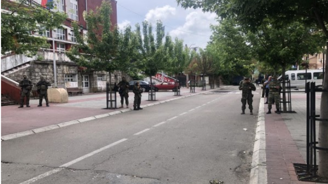 Pjesëtarët e KFOR-it janë para objektit komunal dhe po qëndrojnë përballë protestuesve.