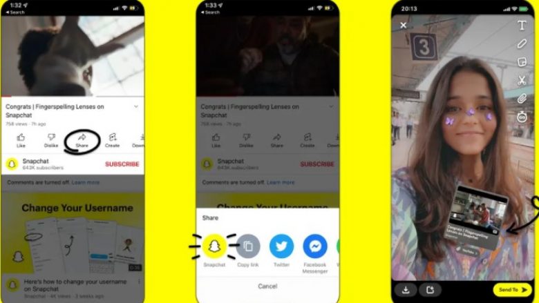 Sipas medieve të huaja, tani, gjithçka që duhet të bëni është të kërkoni videon në YouTube që dëshironi ta ndani, shtypni butonin “share” dhe më pas zgjidhni aplikacionin Snapchat.